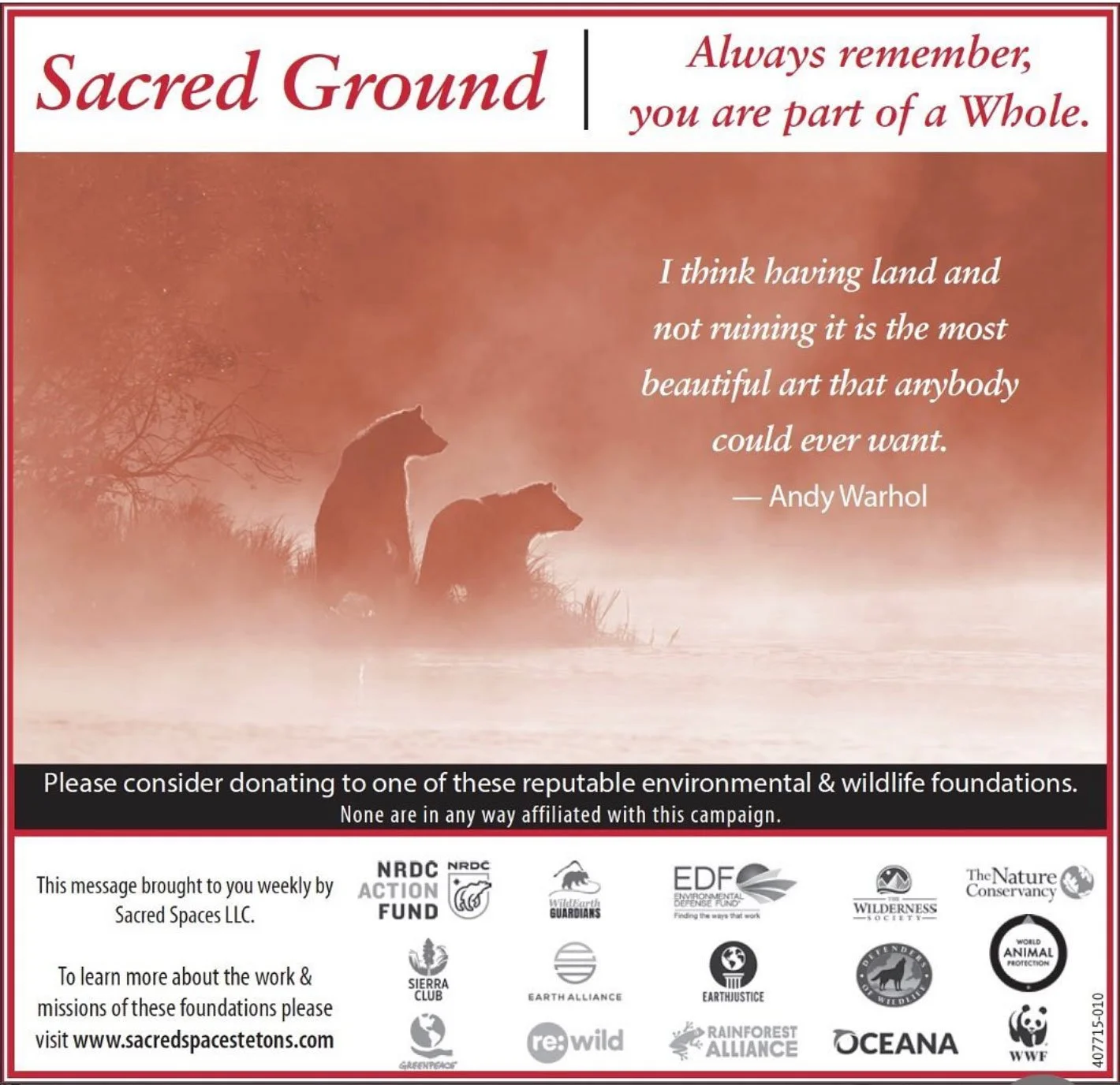 Sacred Ground is an awareness campaign intended to serve as a reminder to us all that we are part of a Whole. Sacred Ground is privately funded by this LLC.